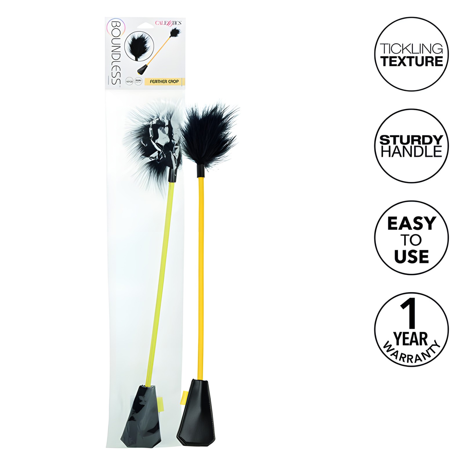 Combine mischief and pleasure with the Boundless Feather Crop! This playful BDSM tool features a faux leather whip and teasing feathers for a thrilling experience.