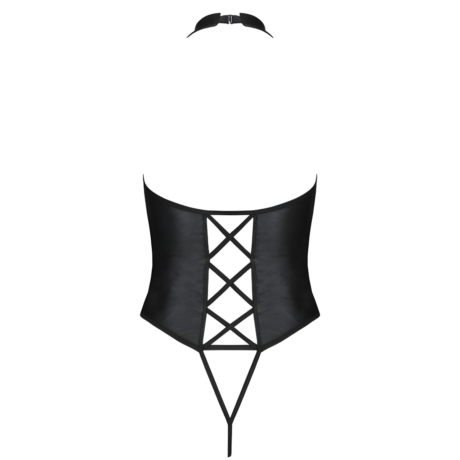 - Made from black eco-leather with a deep neckline.