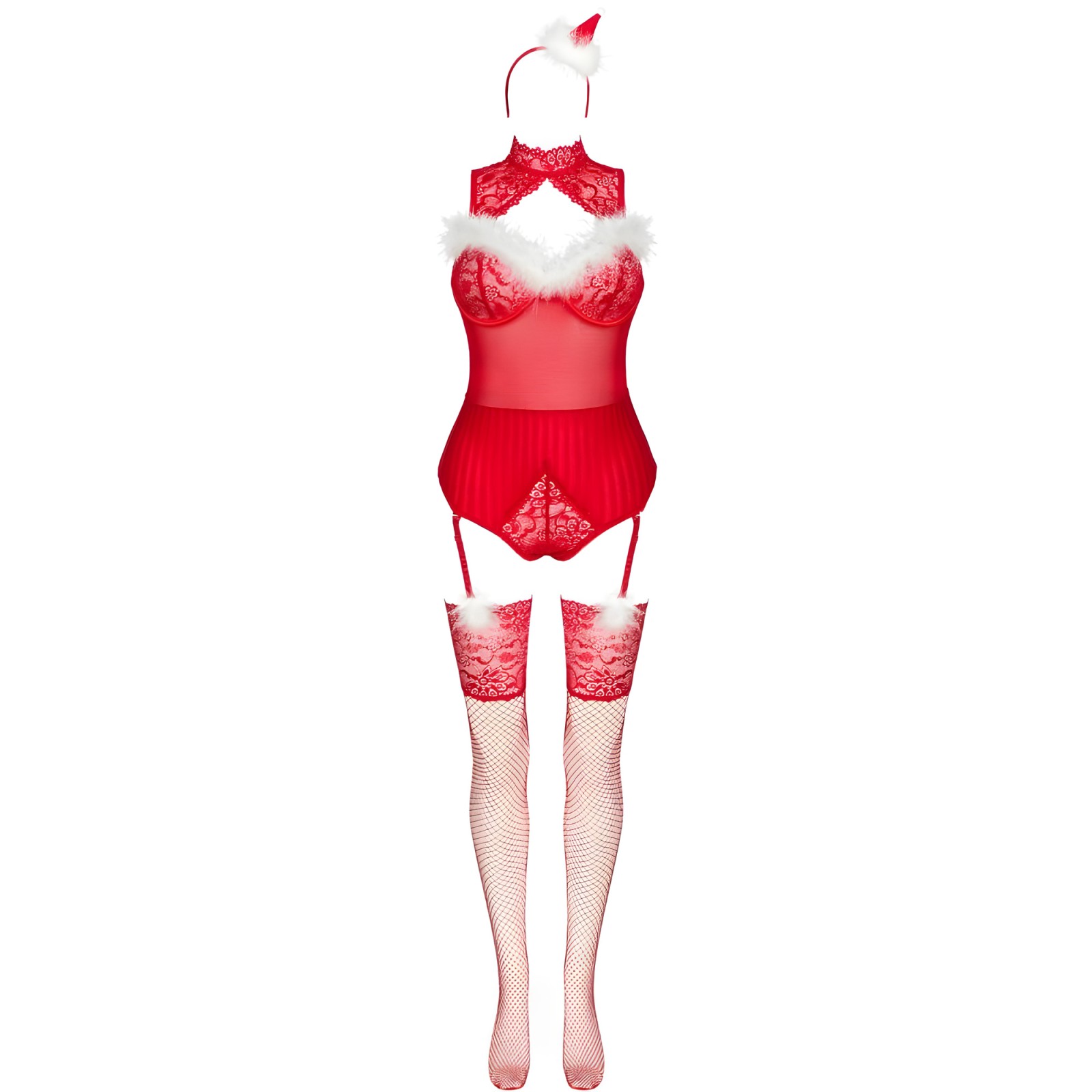 The body enhances your silhouette, while the matching stockings complete the look with sophistication.