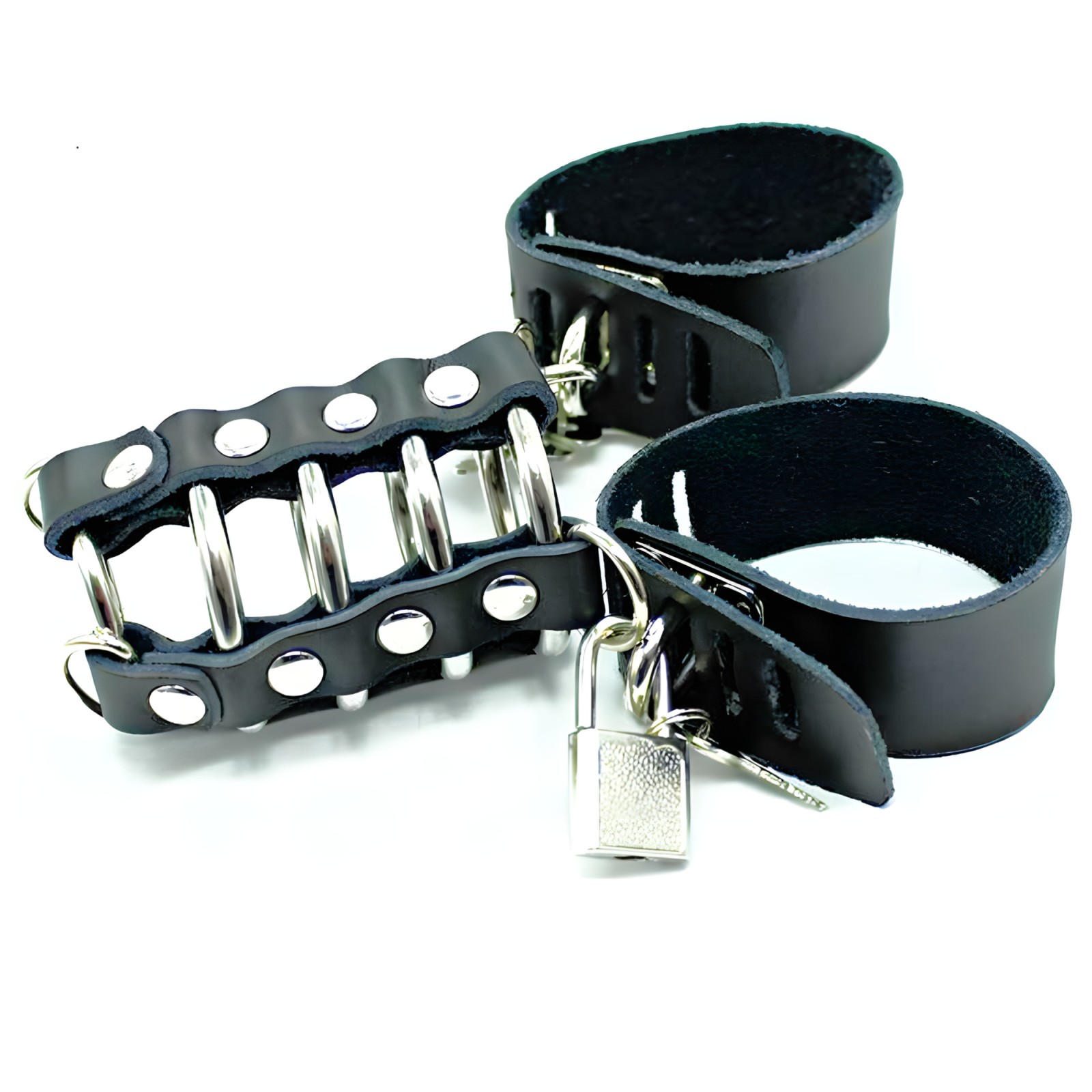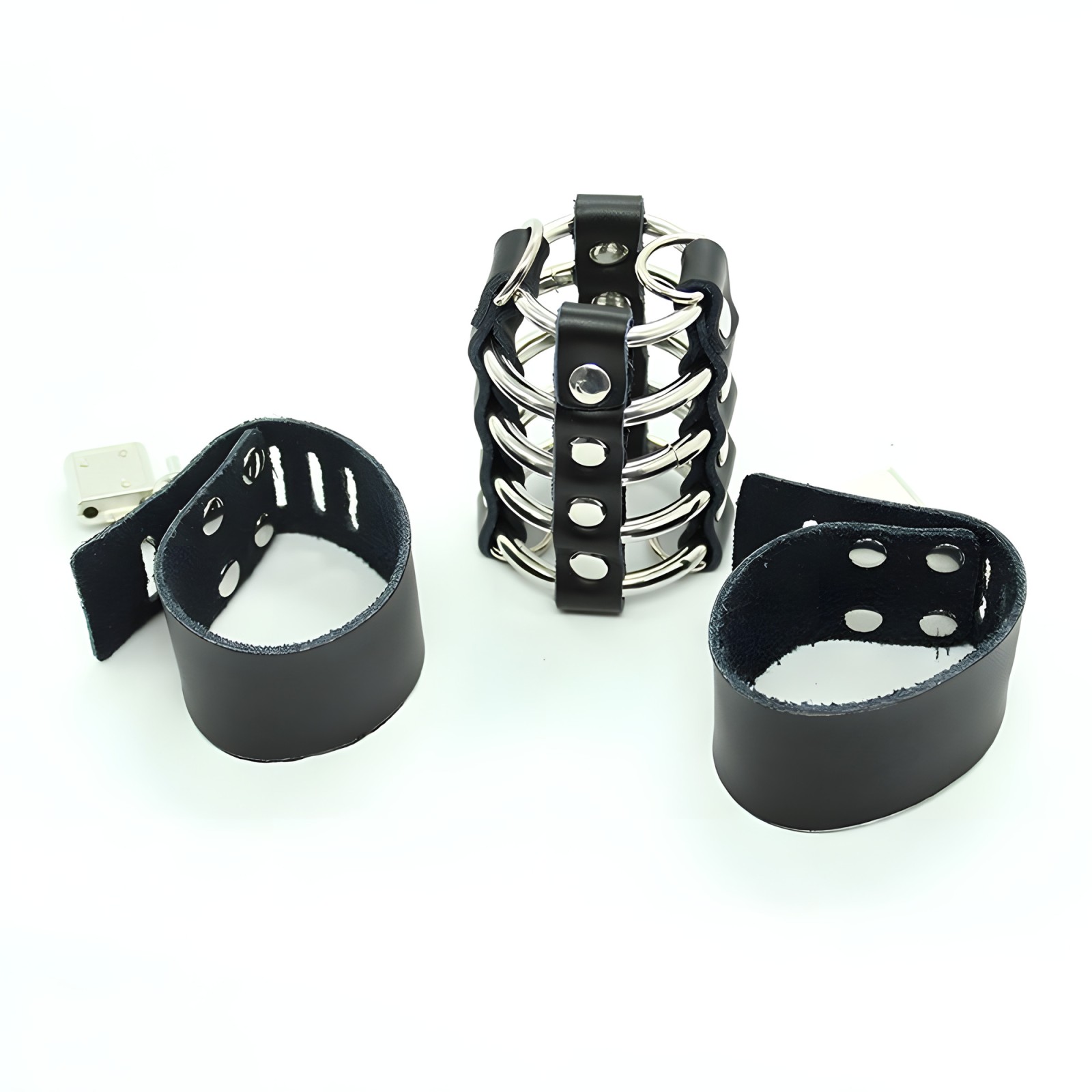 Designed for fetish enthusiasts, this cage features adjustable leather straps and durable metal rings for a secure fit.