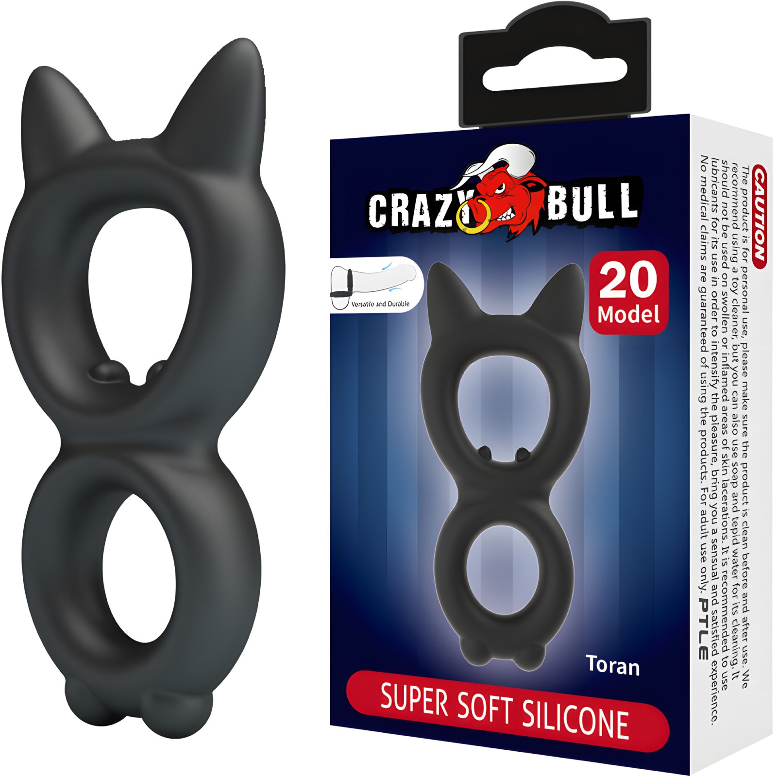 The Crazy Bull Toran Double Silicone Ring Model 20 enhances male intimacy with a comfortable, adjustable fit.