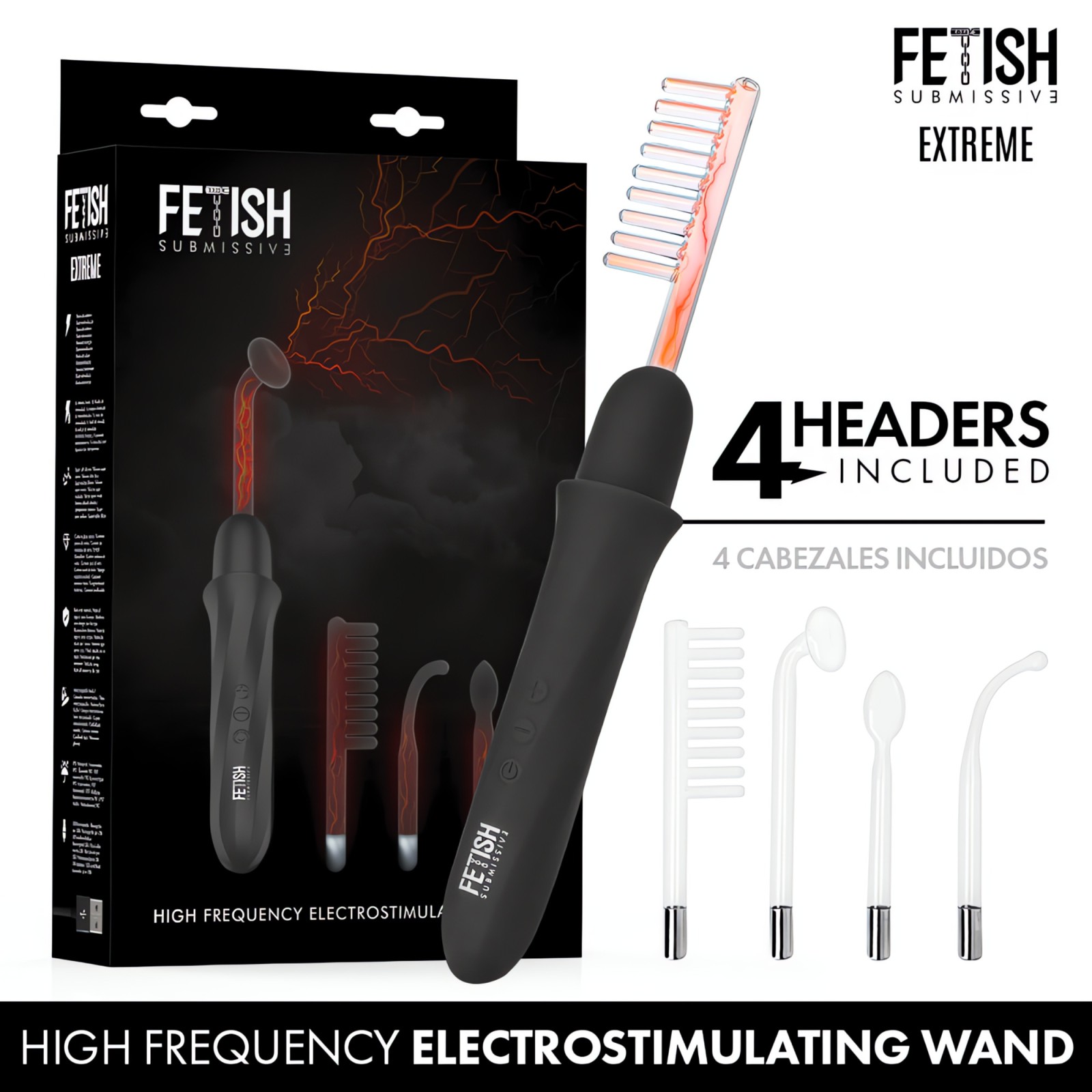 The Fetish Submissive - High Frequency Electro-Stimulation Wand includes four interchangeable heads, each designed to provide different sensations and contact points.