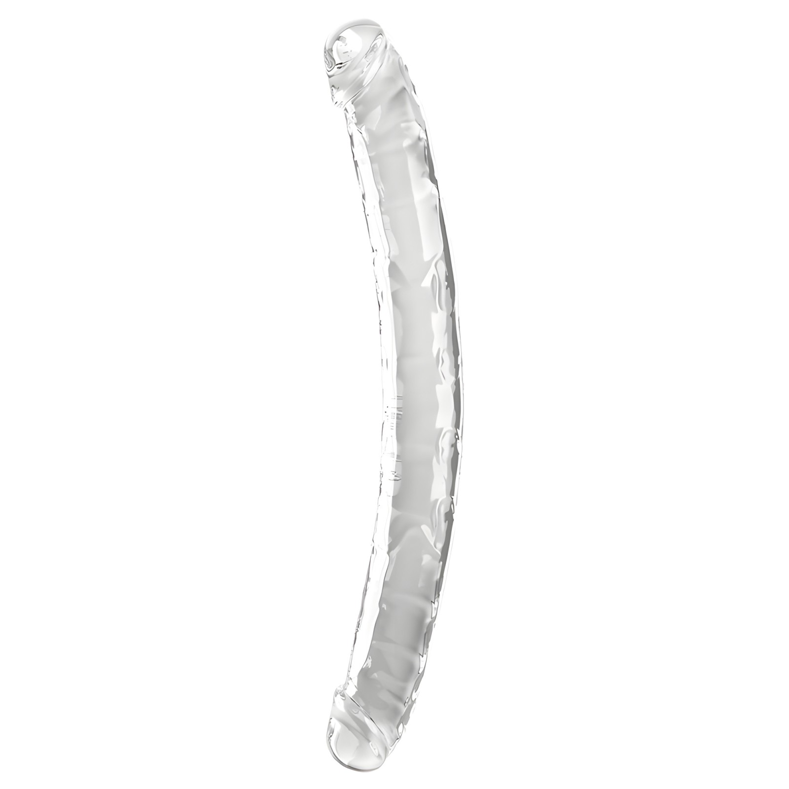 El Dildo Doble King Cock Transparente cuenta con un diseño doble translúcido que simula un pene realista, con un eje flexible, venas detalladas y una cabeza definida.