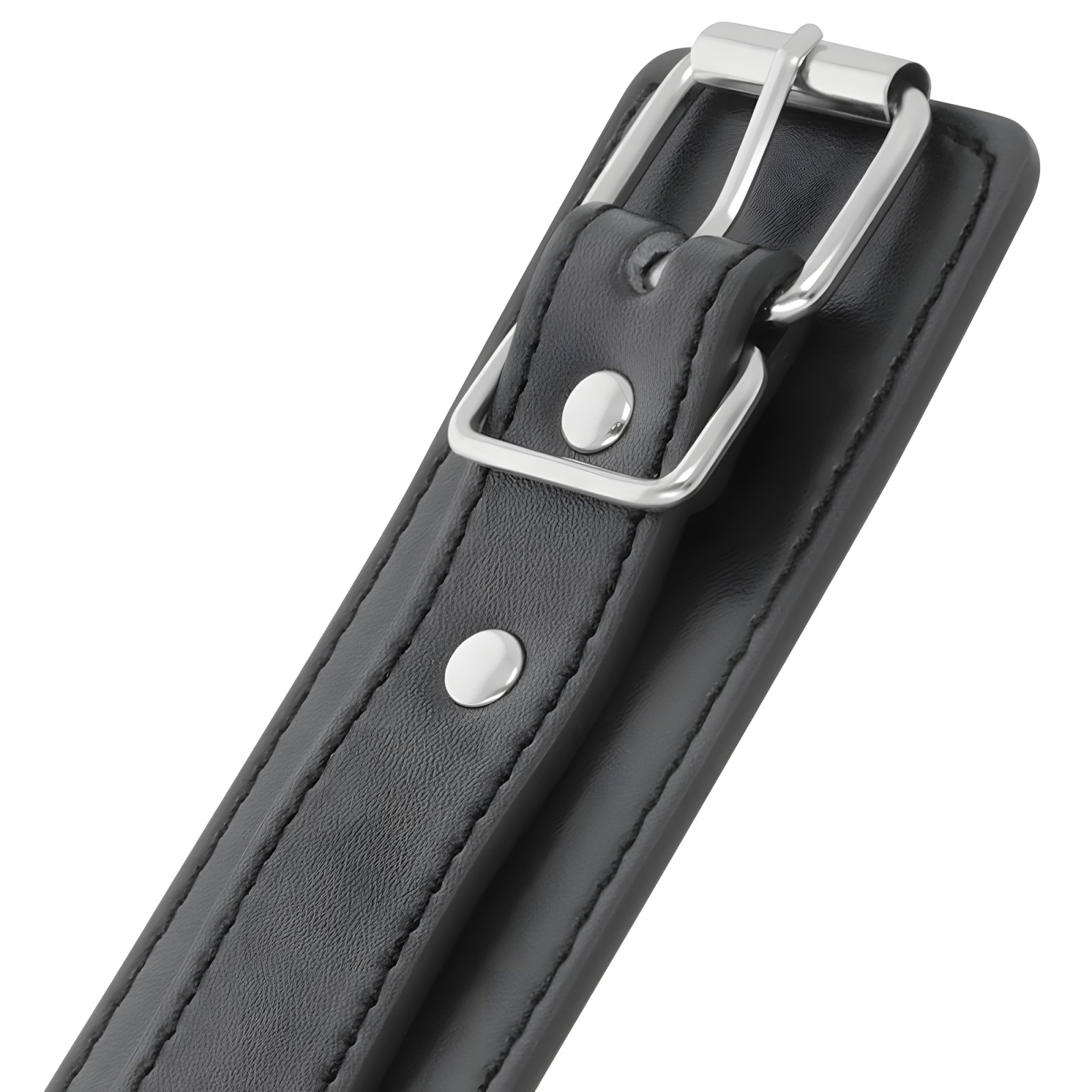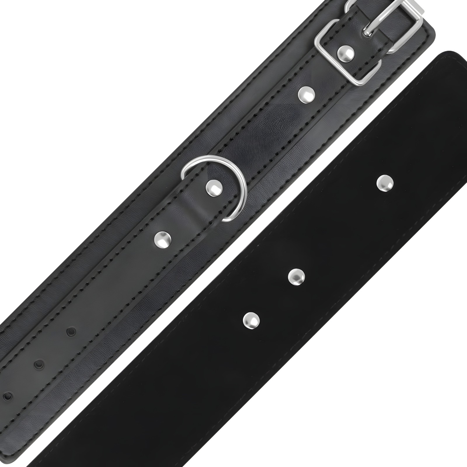 Experimenta la elegancia con las esposas ajustables Darkness, confeccionadas en cuero PVC de alta calidad con doble cinta de refuerzo.
