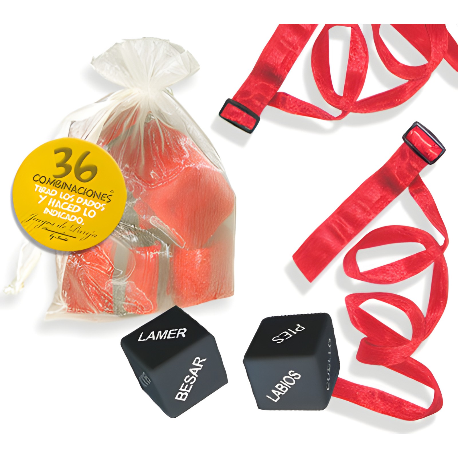 Este kit incluye dos ataduras bondage rojas y dos dados de acción/cuerpo, todo presentado en una elegante bolsa de organza para diversión discreta.
