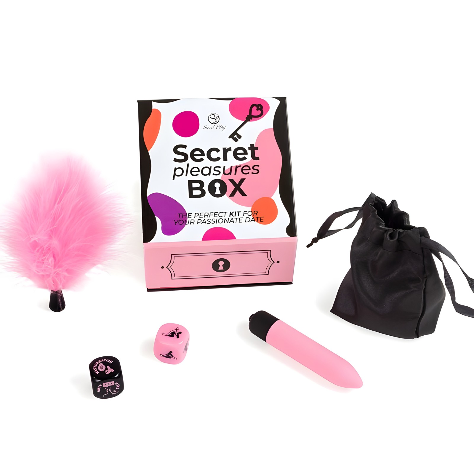 Este completo kit incluye una bala vibradora, un plumero suave para caricias seductoras y dos dados para acciones juguetonas.