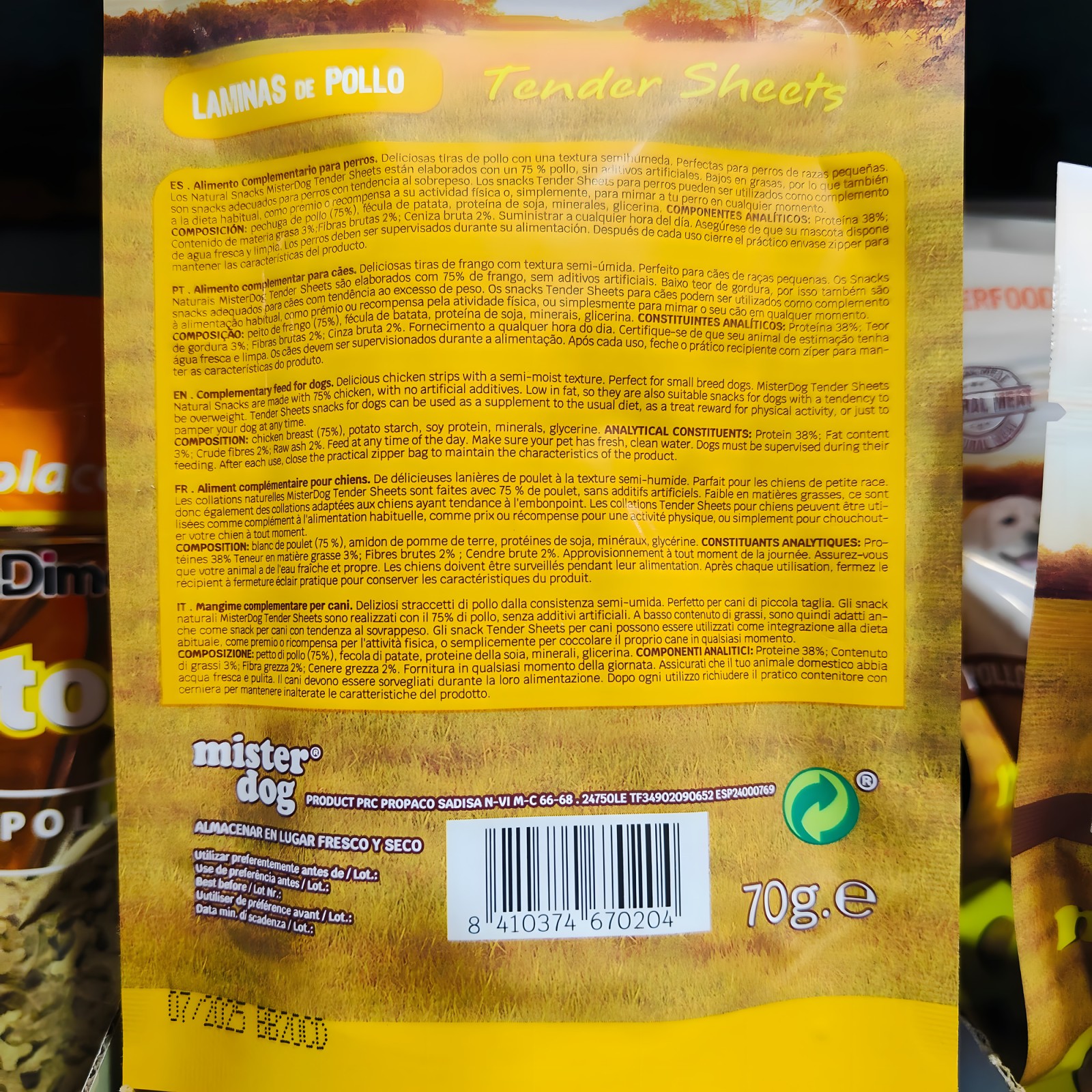 Indulge your furry friend with Mister Dog Chicken Snack 70 Gr, an irresistible treat that will make their tails wag with joy! These chicken snacks are perfect for rewarding your dog during training or just as a special treat.