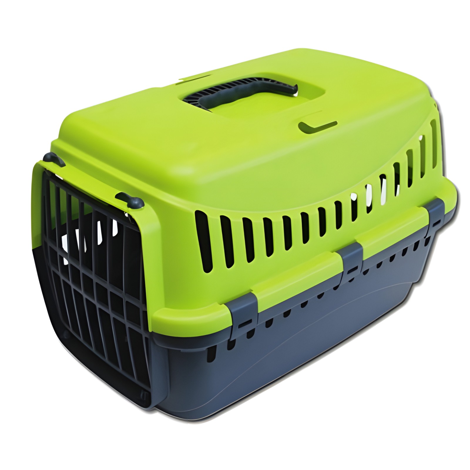 Made from durable plastic, it features a secure front plastic grille and a comfortable top handle for easy transport.