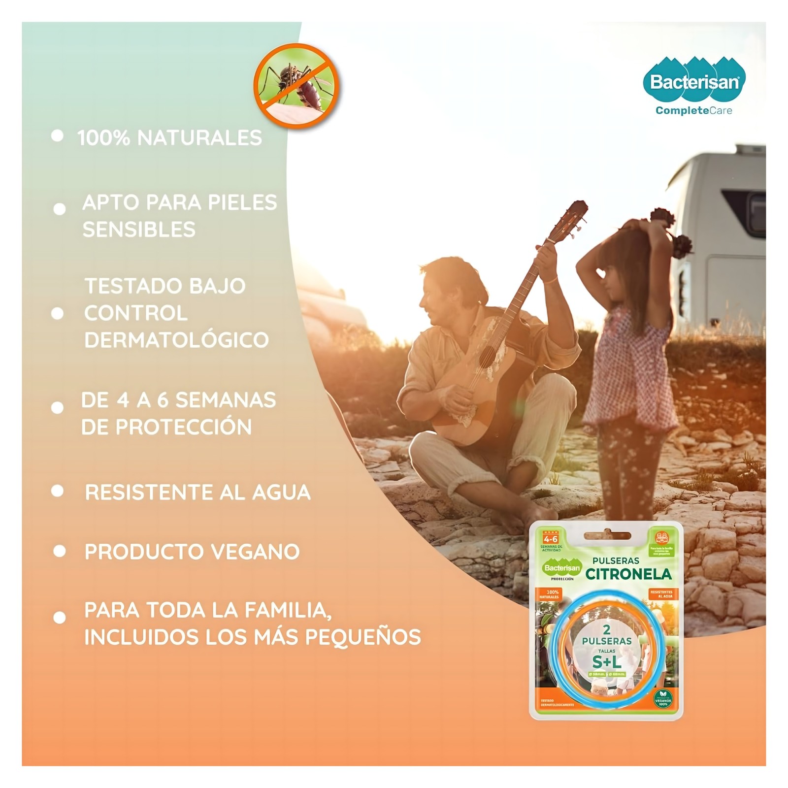 Bacterisan Citronella Bracelets are a pack of 2 (1 size S and 1 size L) aromatic bracelets that act as a 100% natural mosquito repellent.
