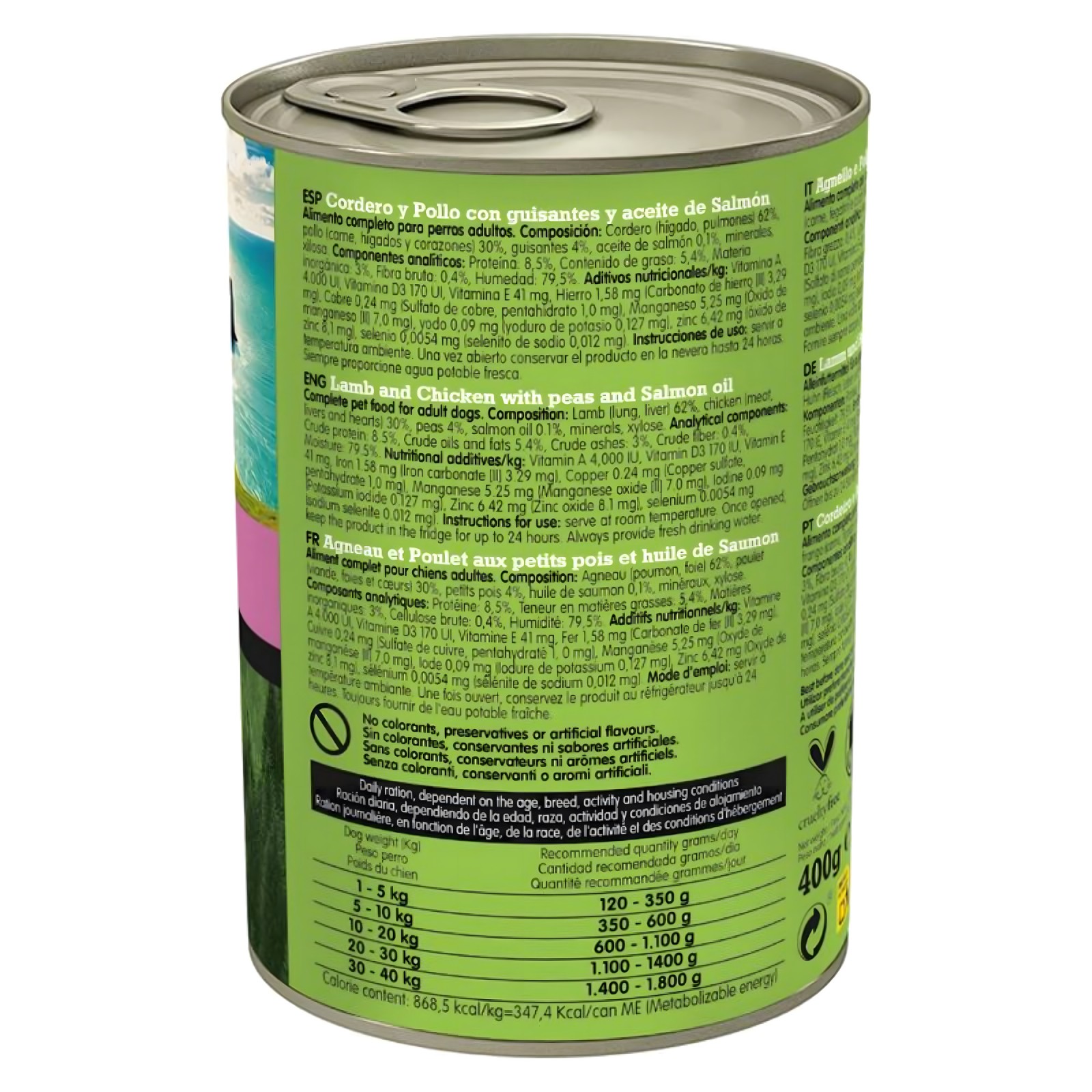 Este alimento húmedo completo está hecho con ingredientes 100% naturales, incluyendo cordero, pollo y guisantes, asegurando una dieta equilibrada para perros de todas las razas.
