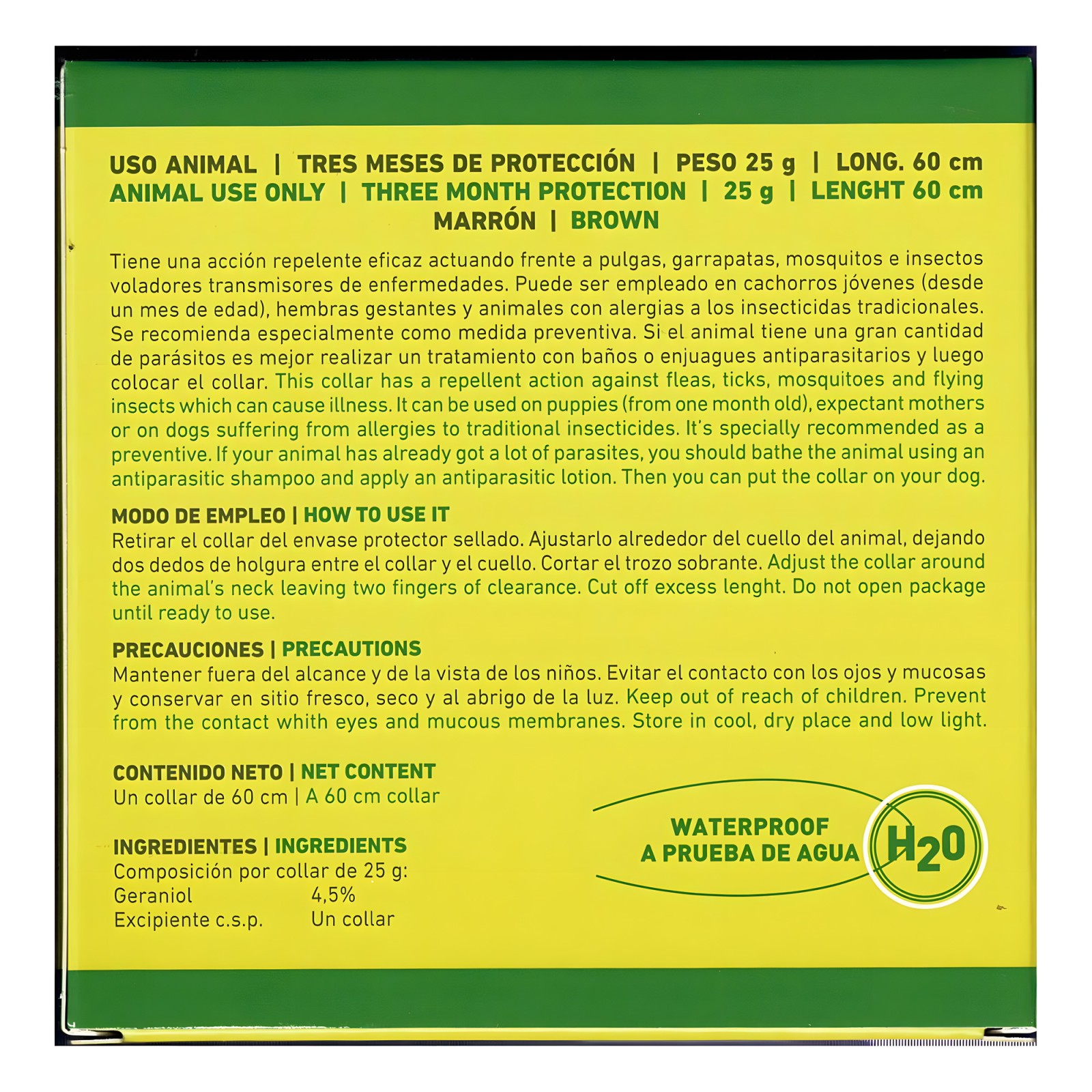 Eficaz contra pulgas, garrapatas, mosquitos y otros insectos voladores, este collar puede usarse en cachorros desde un mes de edad y hembras gestantes.