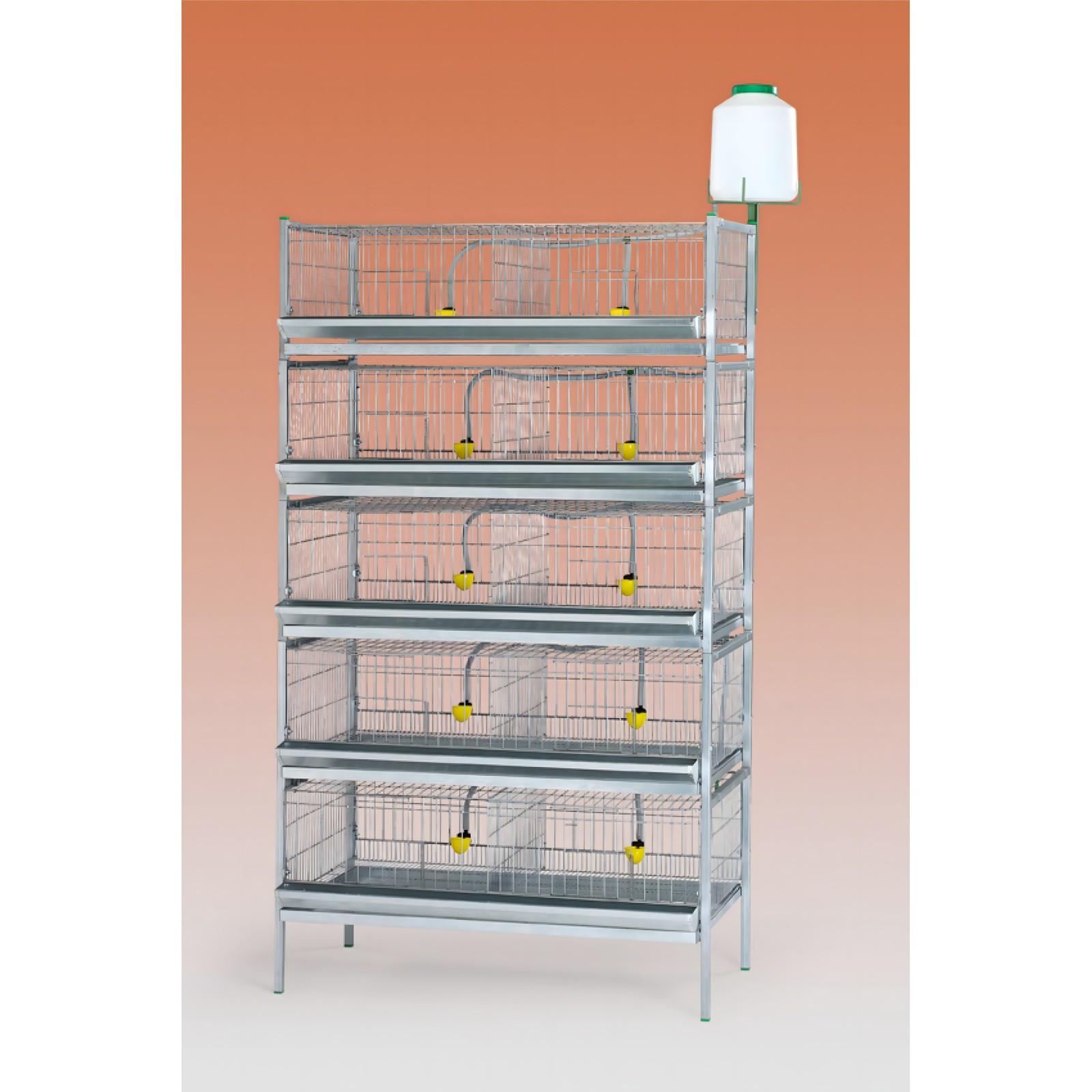 Con dimensiones de 1050 x 620 x 835mm, incluye dos bandejas extraíbles para una fácil limpieza, un comedero de canal y bebederos de cazoletas con un depósito de 10L.