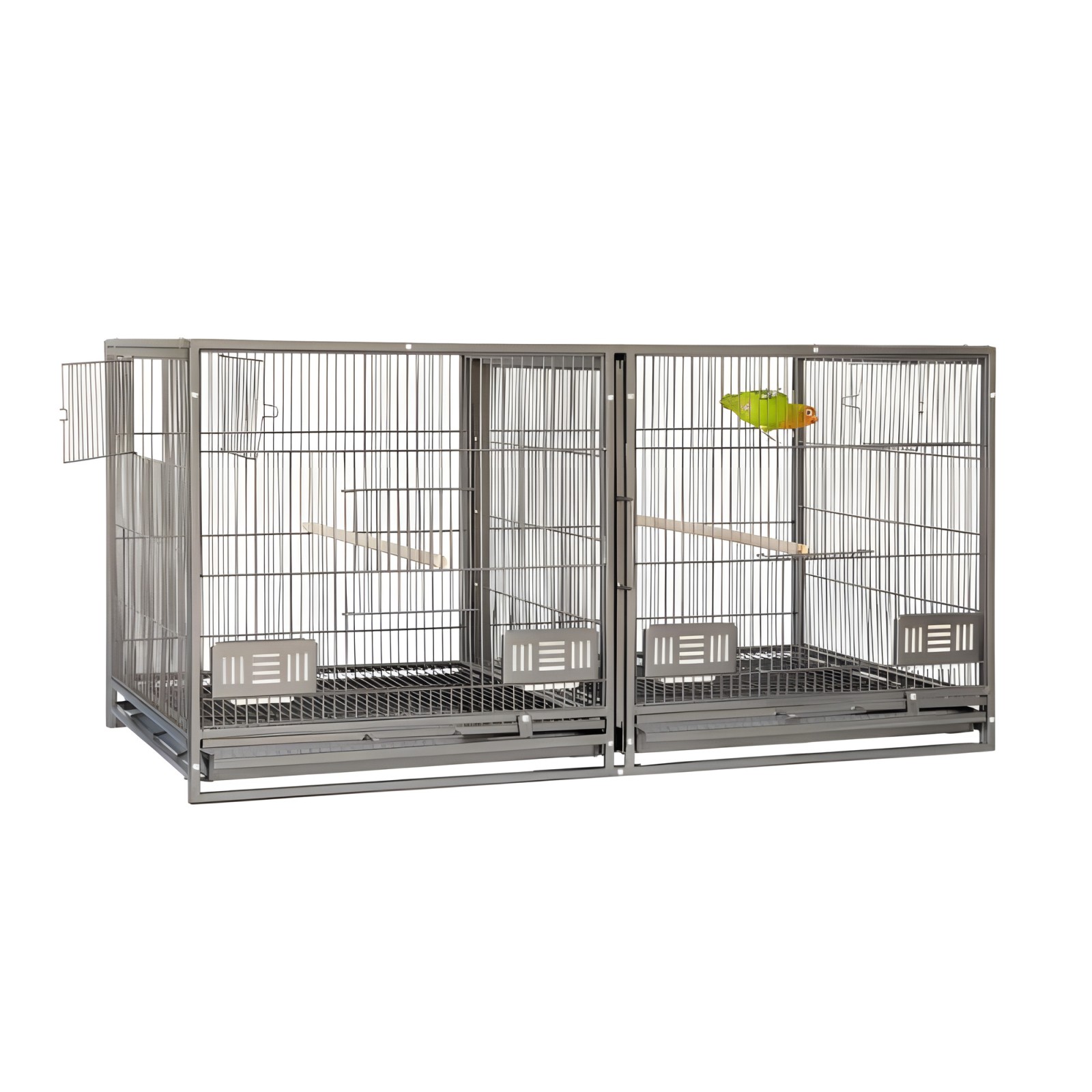 Diseñada para un fácil acceso y mantenimiento, esta jaula cuenta con bandejas y puertas removibles para anidar.