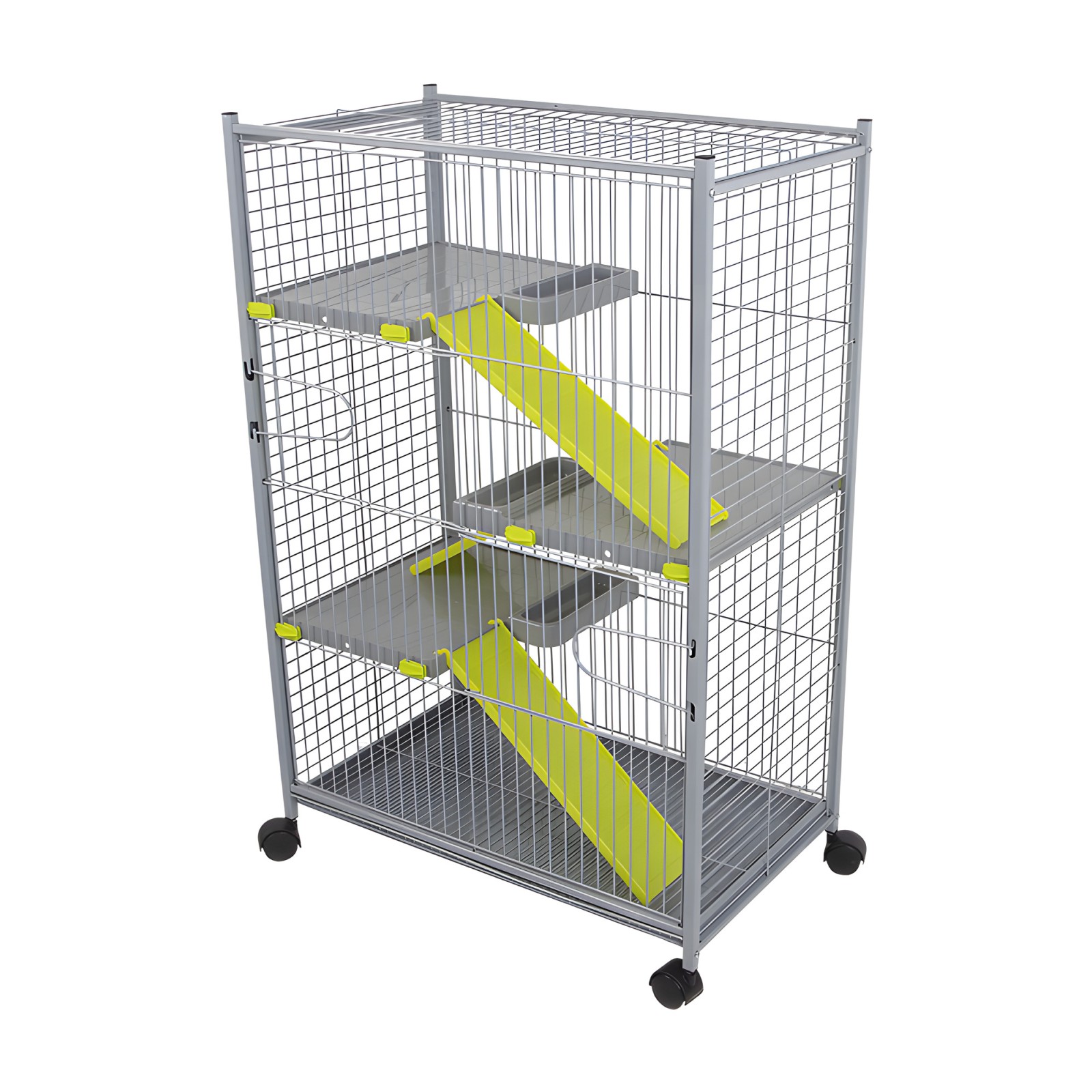 Además, la jaula cuenta con ruedas, lo que facilita su movilidad y ubicación en cualquier parte de tu hogar.