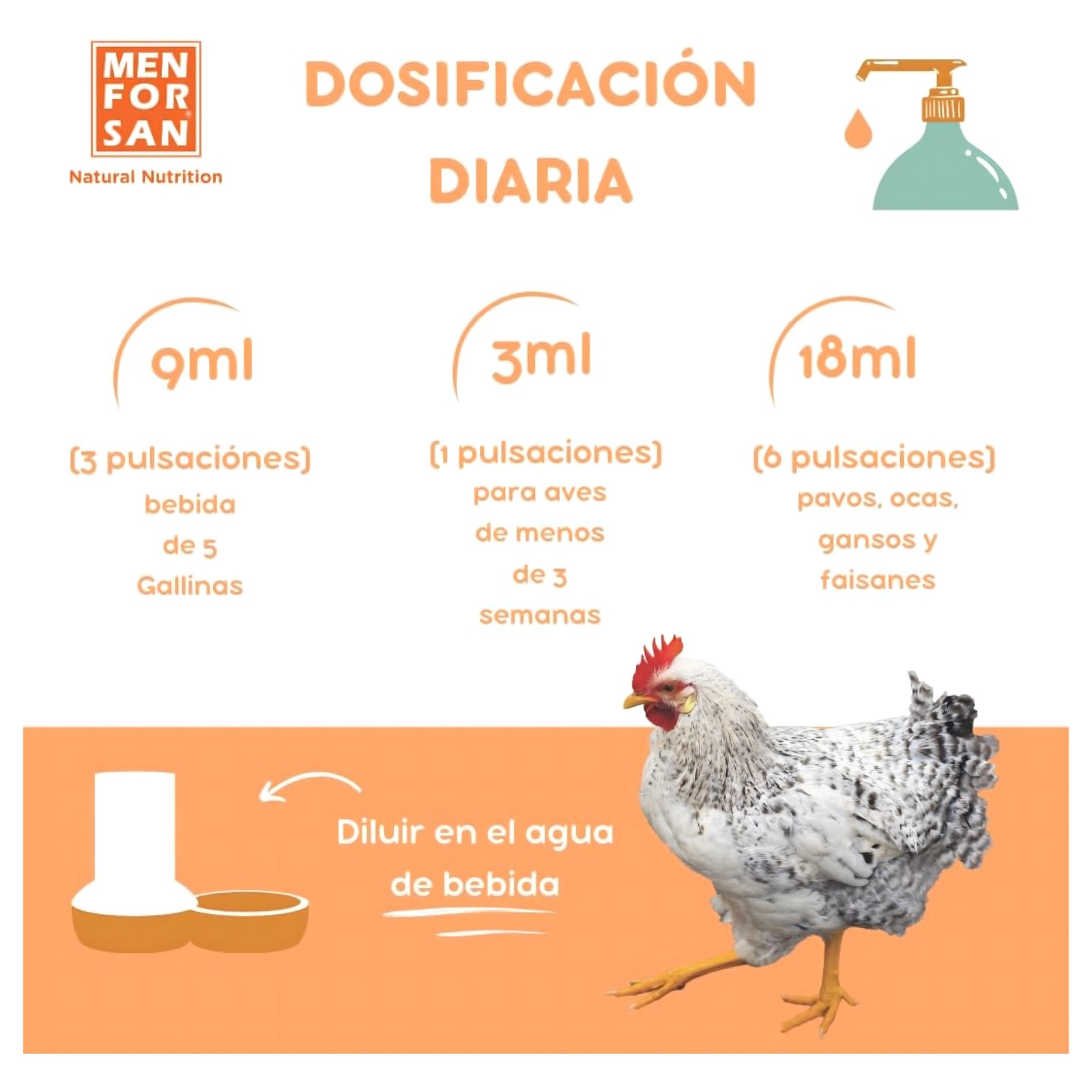 La dosis recomendada para gallinas ponedoras es de 3 pulsaciones al día (9 ml diluidos en el agua de bebida), suficiente para 5 gallinas adultas.
