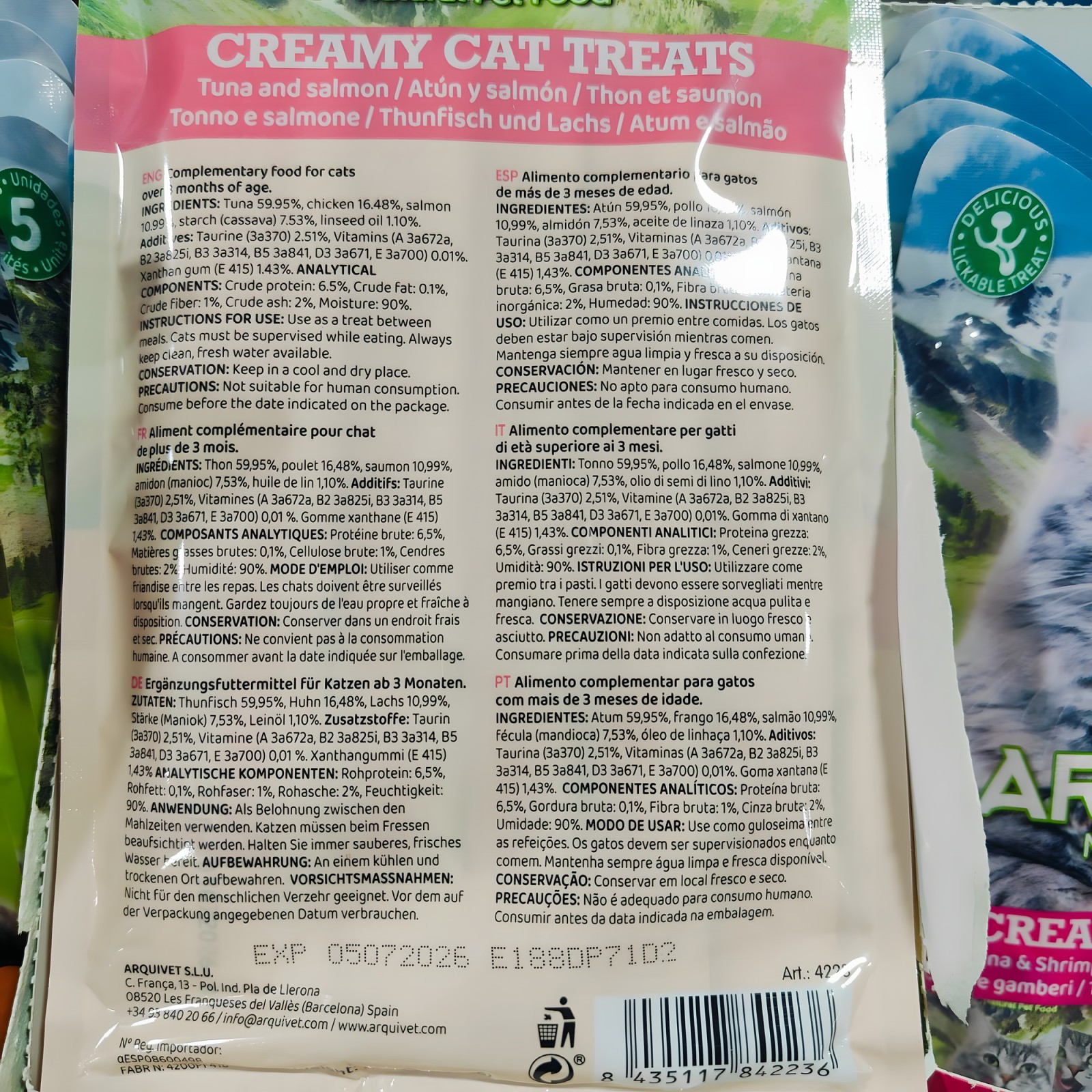 Snack Cremoso de Atún y Salmón para Gatos Arquivet - 5 Sobres de 14g Cada Uno